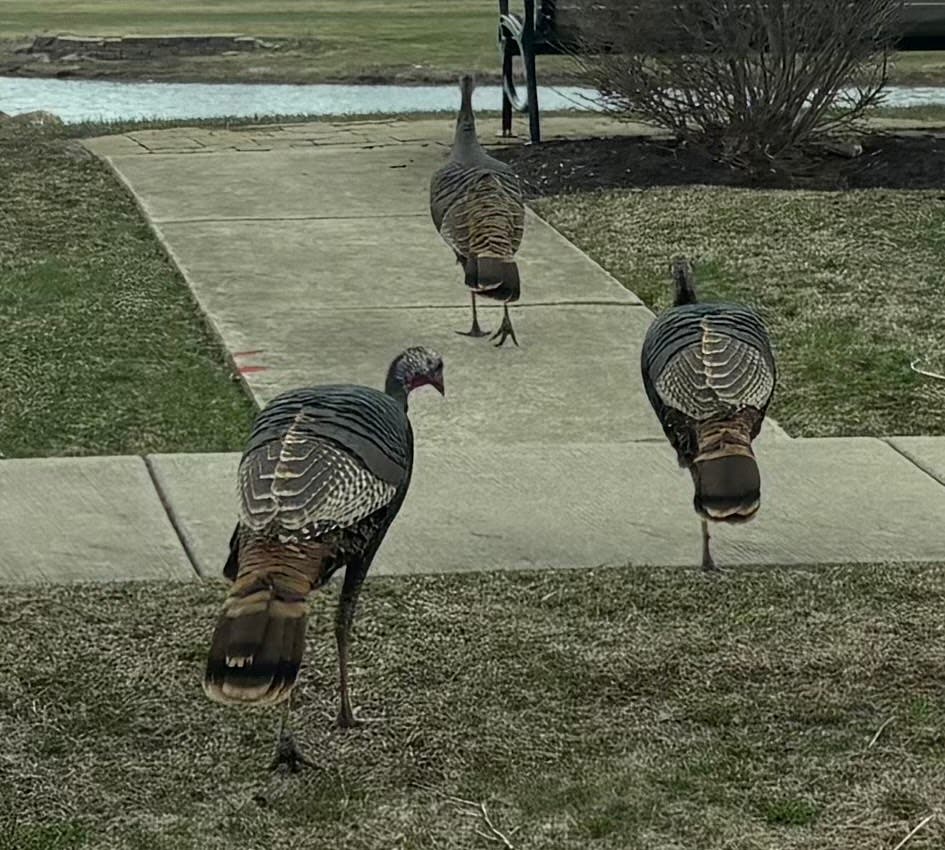 Sue Leston submitted this photo her husband took of some "unexpected guests." The wild turkeys were crossing the Kings Bridge subdivision entrance in Plainfield. "Their coloring is beautiful," Sue tells us.