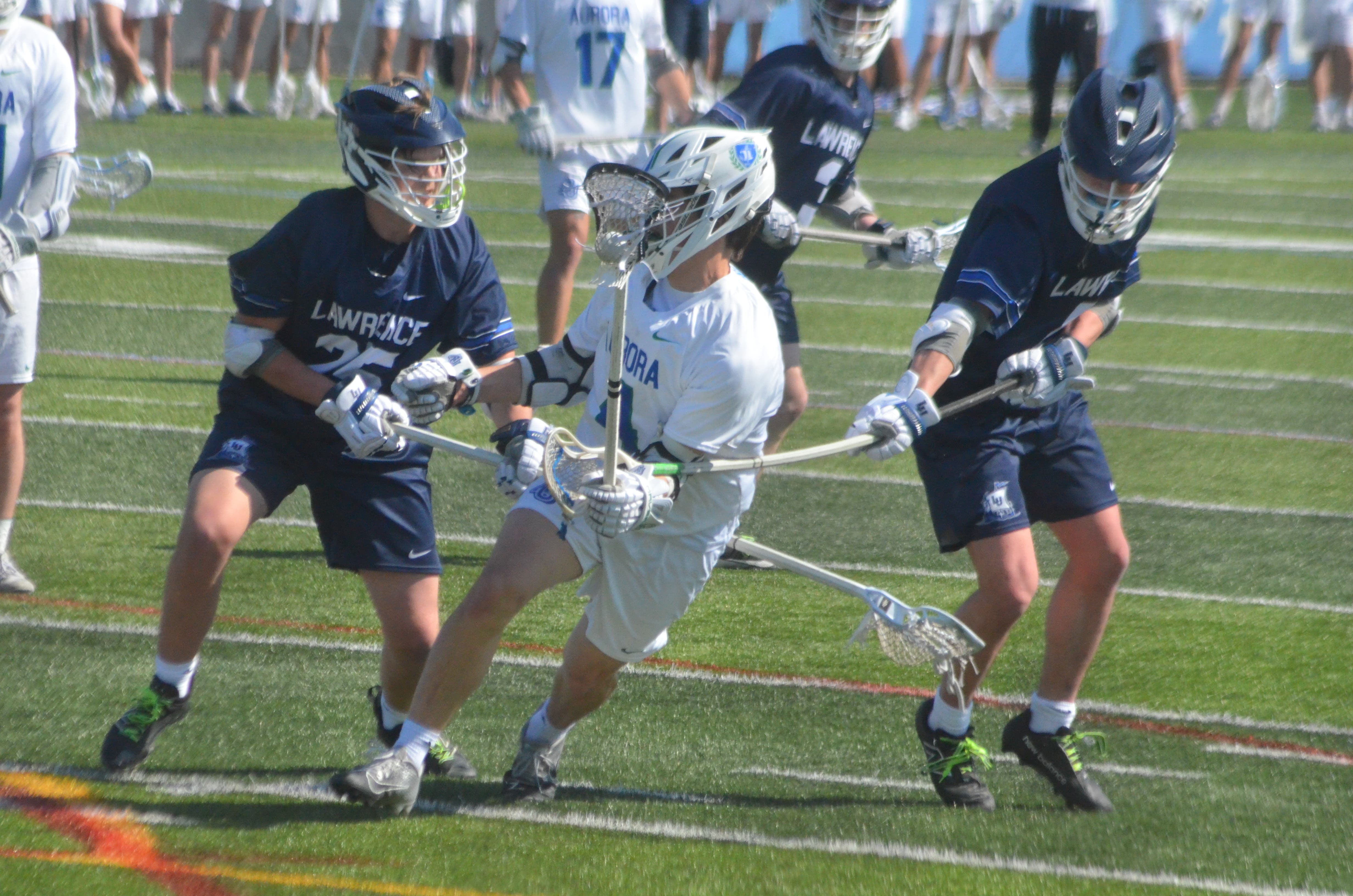 Al Benson photographed Aurora University attacker Tyler Foerstel (center) being double-teamed by Lawrence University defenders during Aurora's recent 30-2 win at Spartan Athletic Park in Montgomery. Foerstel scored two goals.