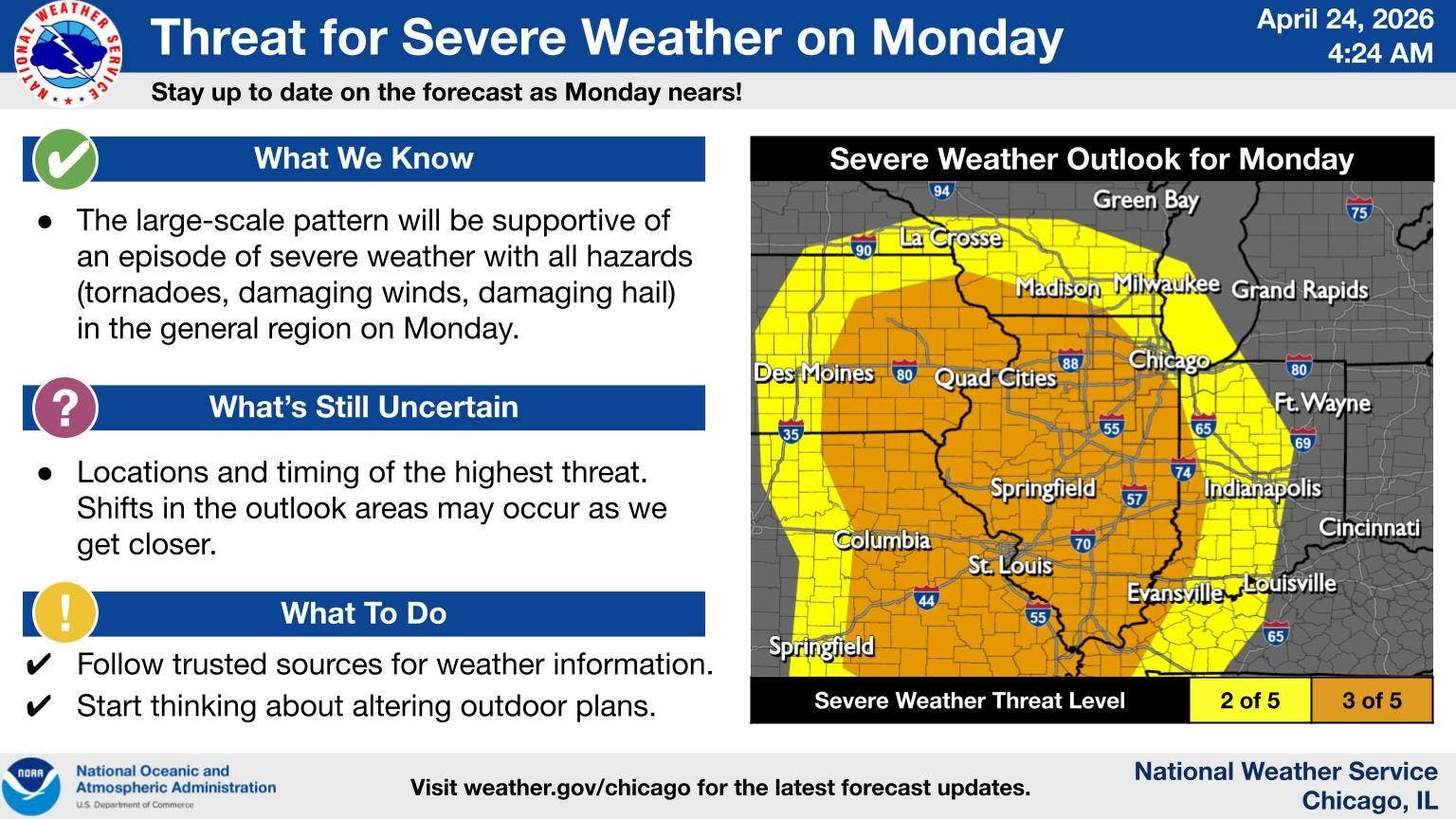 Monday will have a high of 75 degrees, and the weather service said "the large-scale pattern will be supportive of an episode of severe weather with all hazards," including tornadoes.