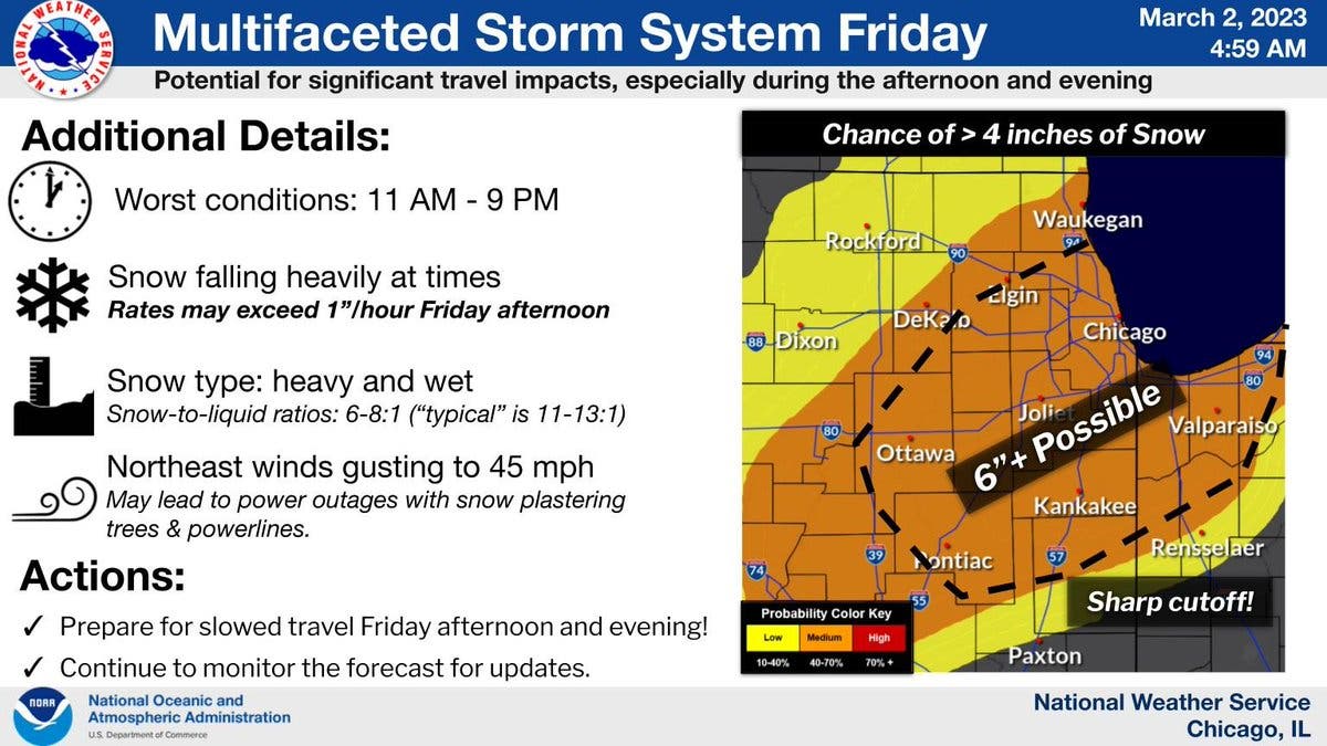 ILLINOIS — A winter storm watch has been issued for the Chicago area as up to 8 inches of snow is possible on Friday. The National Weather Service has issued the watch starting Friday morning and ending Friday evening for Kane, DuPage, La Salle, Kendall, Grundy, Kankakee, Cook and Will counties.