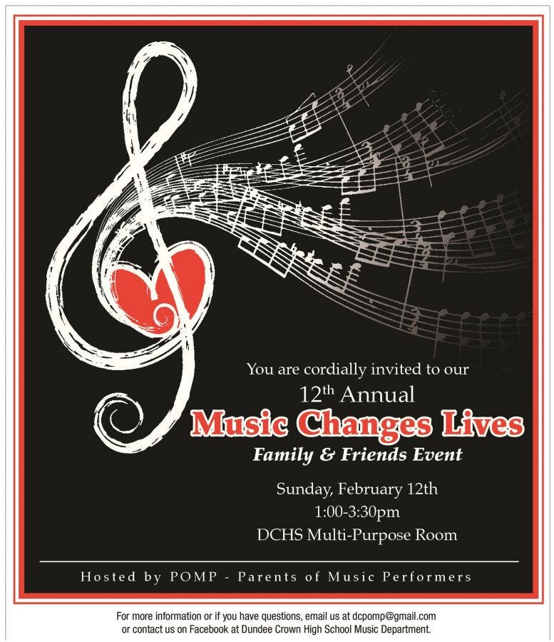 CARPENTERSVILLE, Illinois – January 12, 2017 – Dundee Crown High School’s Music Booster Club, POMP, hosts their 12th annual Music Changes Lives Friends and Family Event on Sunday, February 12, 2017 from 1-3:30pm at the high school. POMP, Parents of Music Performers, invites families, friends and the community to an afternoon of music performances by the DCHS Jazz Bands, Chamber Orchestra, and Chamber Choir along with a sneak peek preview from the upcoming spring musical, Anything Goes. A silent auction featuring a wide array of items donated by local businesses and a 50/50 raffle will also be available. Light appetizers, desserts and drinks will be served. All proceeds benefit POMP’s scholarship programs.