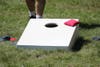 The object of the game is to toss all the bags into the hole or on to the board — making the bag into the hole nets three points, while putting at bag on the board nets one point, and players on opposing teams alternate shots.