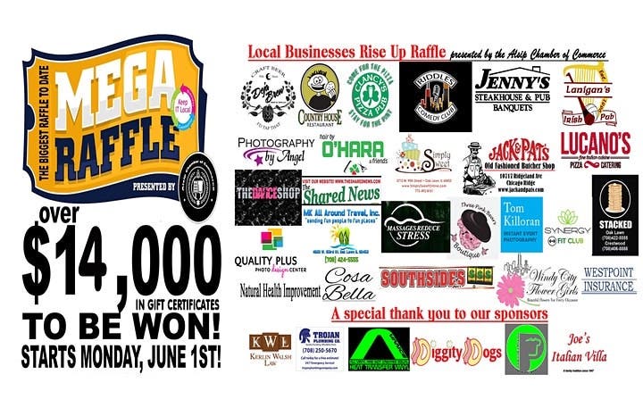 ALSIP, IL — Three lucky winners could snag a grand prize of $4,500 each in gift certificates in a small business mega raffle organized by the Alsip Chamber of Commerce. Tickets for the “Local Businesses Rise Up Mega Raffle” are $10 each and can be purchased through June 21 on Eventbrite.