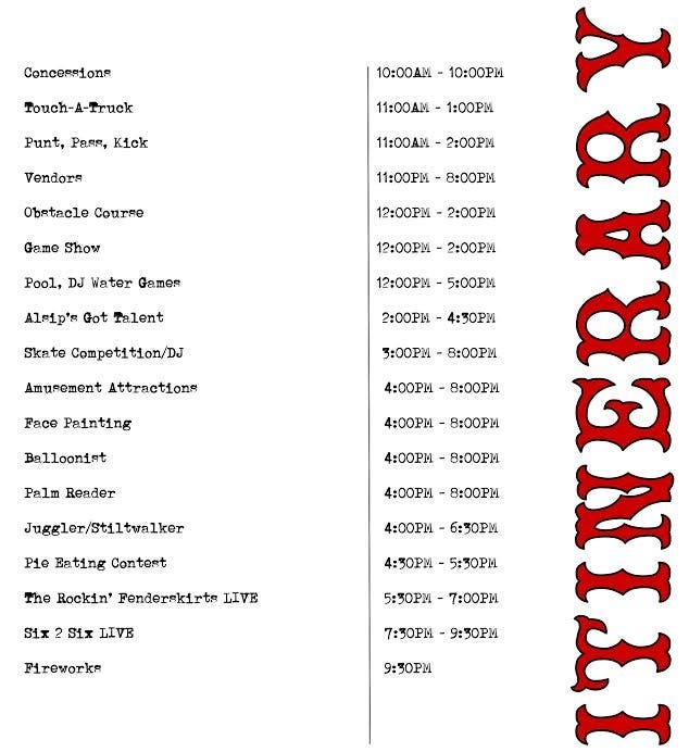 Among the featured activities are free swimming, live bands, Alsip’s Got Talent, children’s games and a pie-eating contest, capped off by an evening fireworks display. Starting at 5:30 p.m. Saturday, the original Rockin’ Fenderskirts take the stage, playing golden oldies, followed by the Six 2 Six Band that “will play anything” at 7:30 p.m