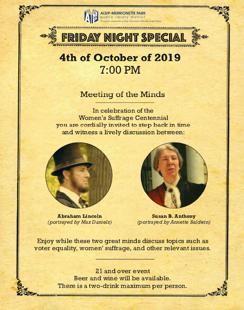 ALSIP, IL — It’s hard to believe that before 1920, American women did not have the right to vote. In celebration of the Women’s Suffrage Centennial, the Alsip-Merrionette Park Public Library will host a “Friday Night Special” starting at 7 p.m. at Oct. 4, featuring a lively discussion between the 16th U.S. President and the leader of the women’s suffrage movement.