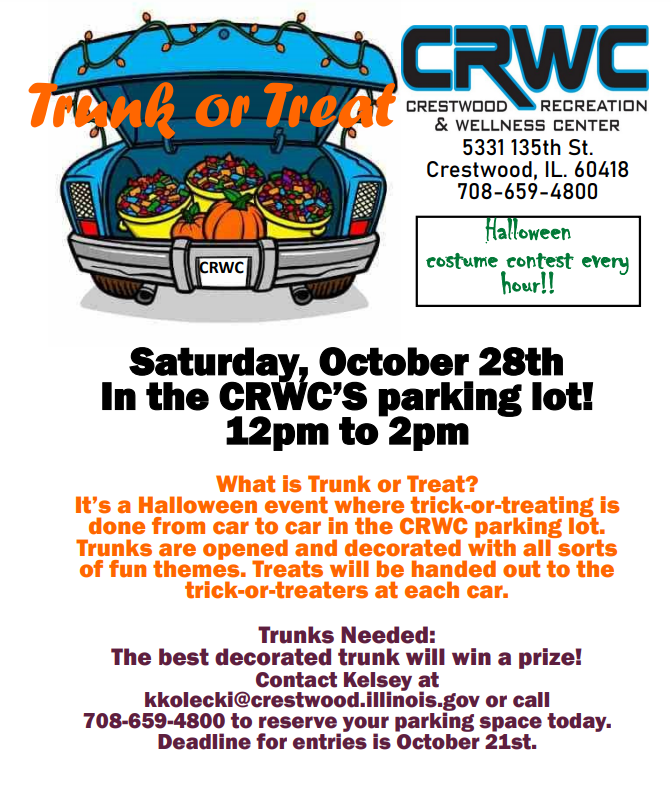 Wear your costume and come to the Crestwood Rec Center, Saturday, Oct. 28, for Trunk or Treat. Costume contests will be held every hour.