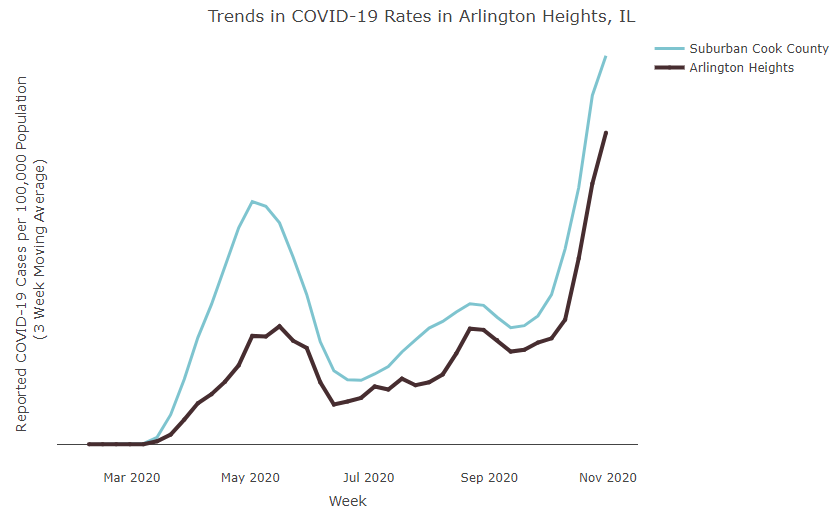 There has been a 157 percent increase in cases in Arlington Heights over past 14 days according to the Cook County Department of Health.