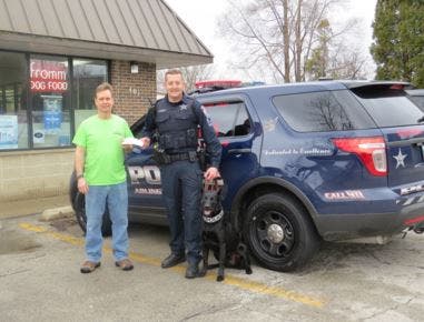 Photo caption: Officer Tegtmeyer and Yara are with Animal Feeds and Needs owner Chuck Hume. Mr. Hume presented a check to Tegtmeyer on behalf of the charitable venture.