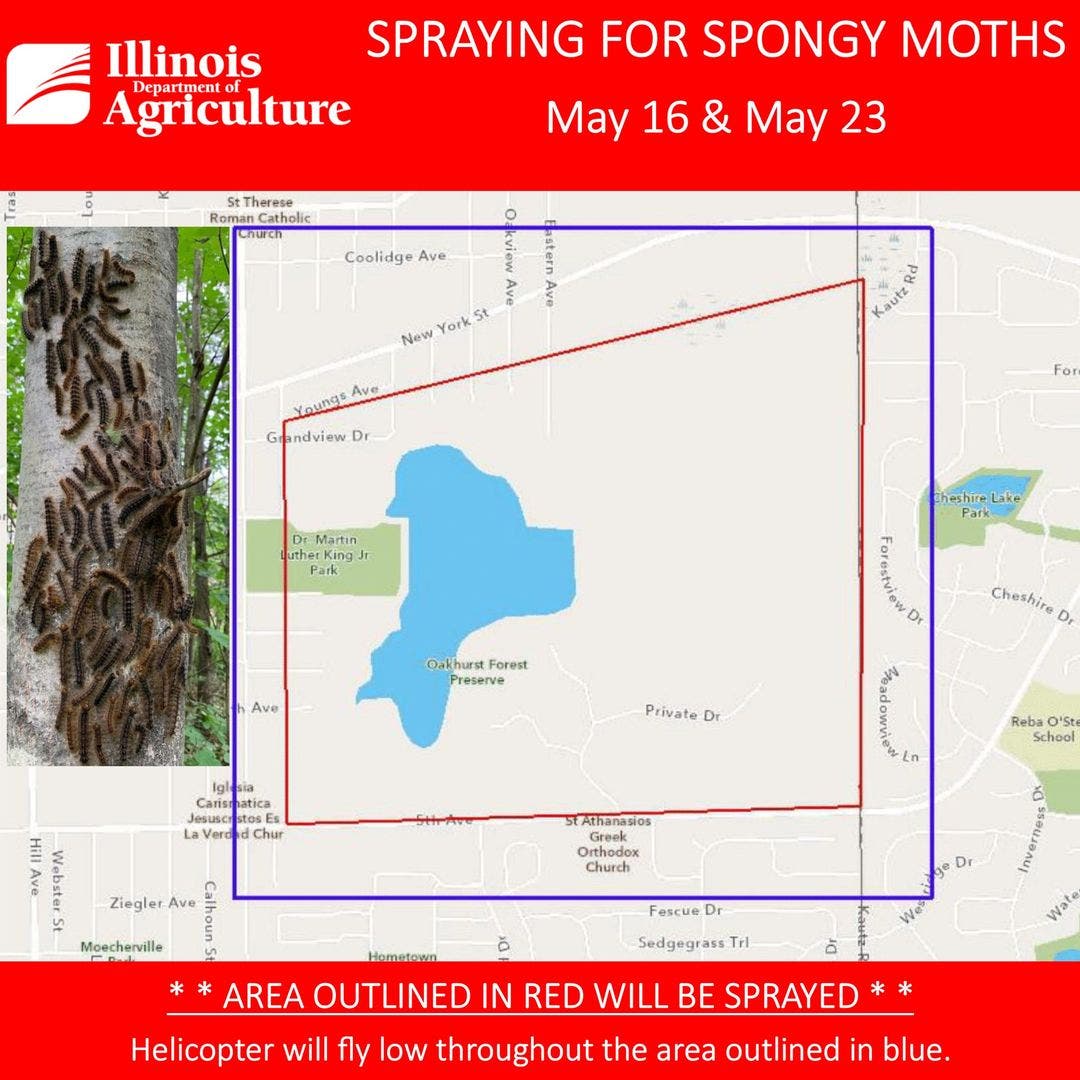 To reduce it, a contractor from the Illinois Department of Agriculture will be flying a helicopter to target the areas around Oakhurst Forest Preserve. The treatment is taking place in two batches: the first happened in the morning on May 16, and the second is planned for May 23, weather permitting.