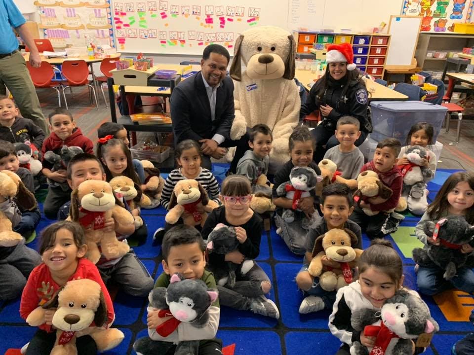 AURORA, IL — Police and firefighters in Aurora took a little time off to bring some joy to local children just before the holidays. The Heroes with Hearts and Hugs program, sponsored by PetSmart and helmed by Aurora Police Department Officer Sandra Navarette, visited Aurora classrooms to pass out hundreds of stuffed animals.