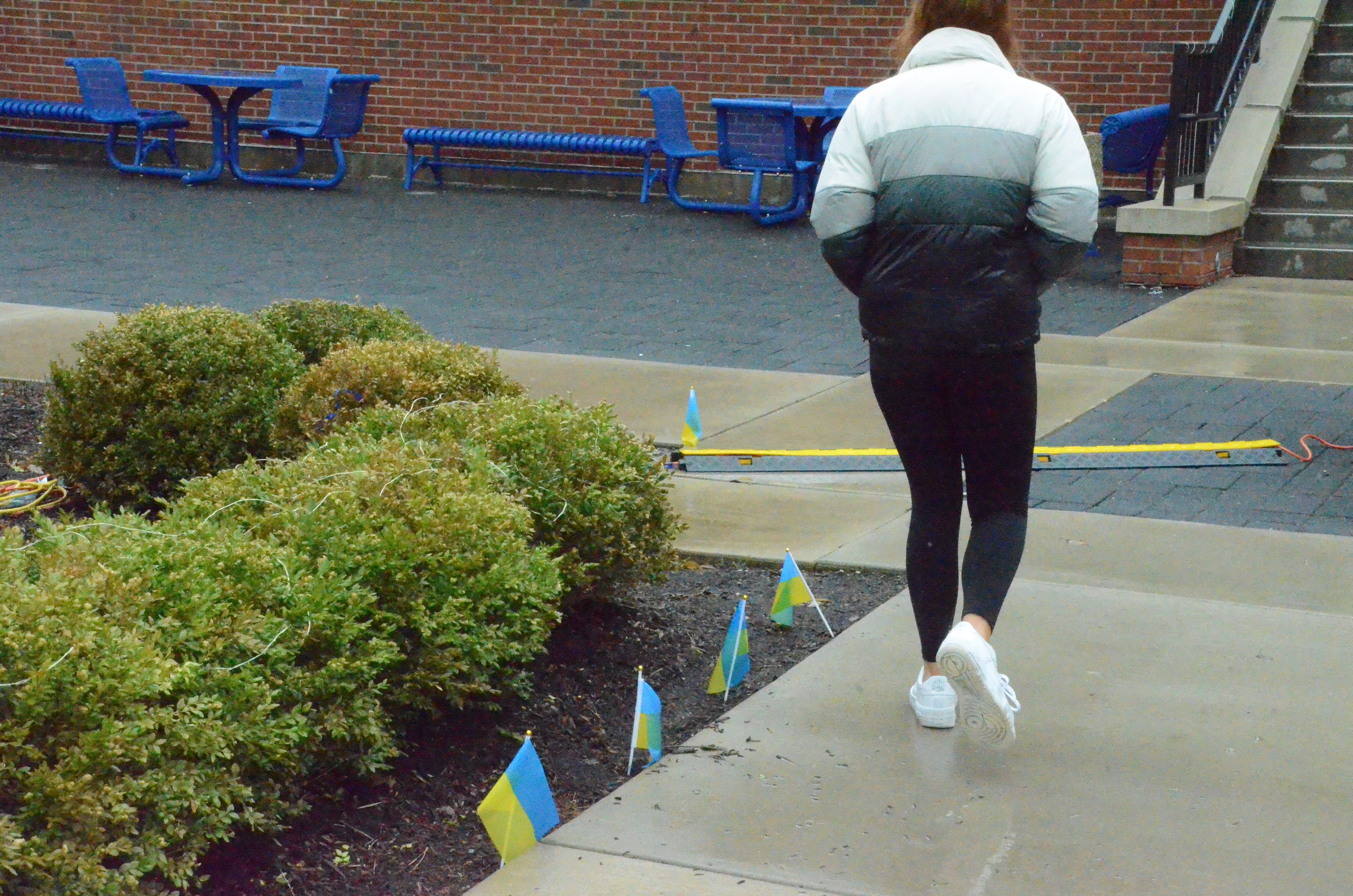 An Aurora University student walks past mini Ukrainian flags lining the sidewalk outside Alumni Hall.