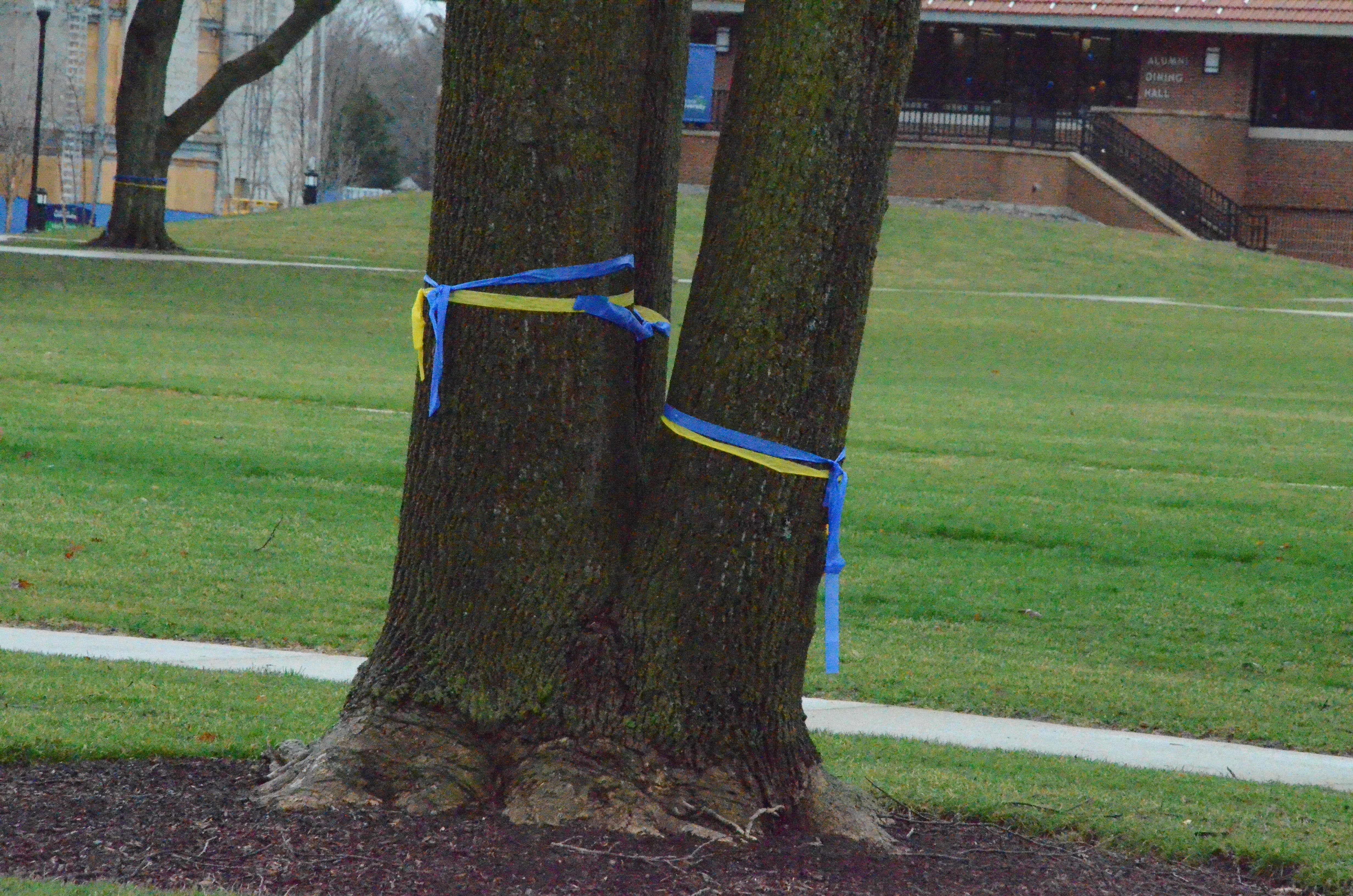 Trees throughout campus are wrapped with blue and yellow ribbons, and mini flags are planted in tree beds lining a sidewalk outside Alumni Hall.