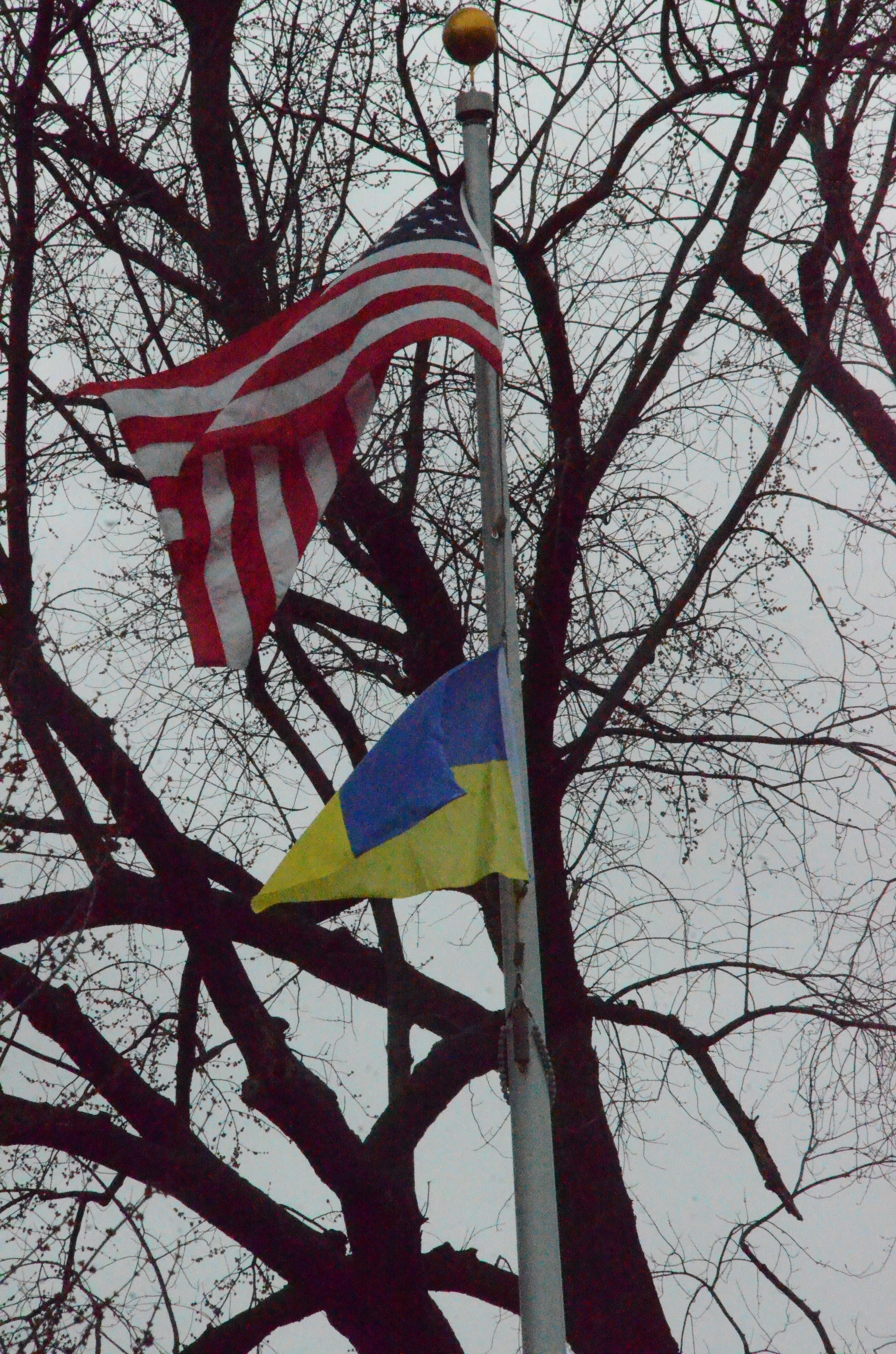 In another show of support, the Ukrainian flag rests below the American flag on a flagpole on the campus's quadrangle.