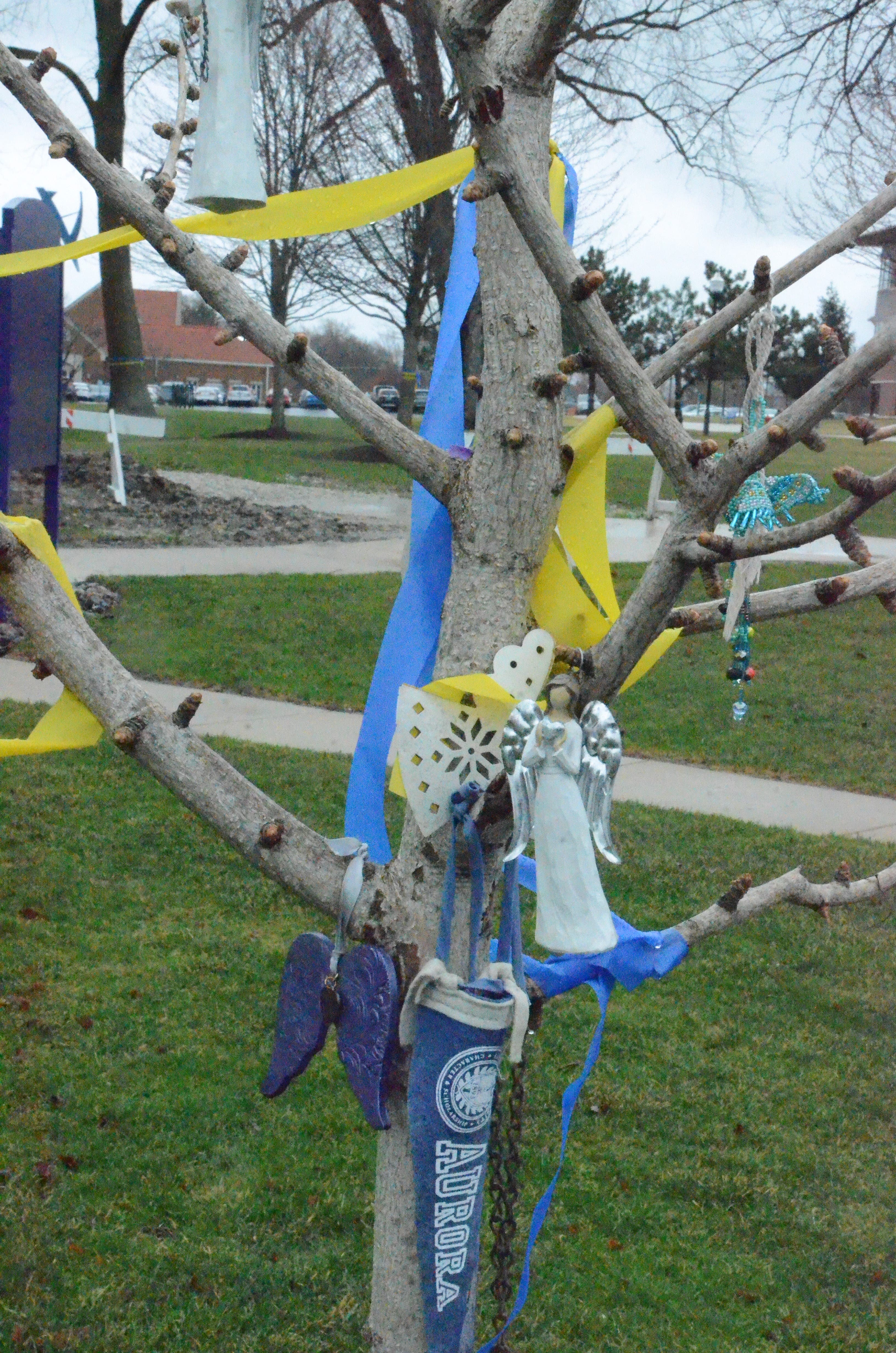 Blue and yellow streamers, matching the colors of Ukraine's flag, are tied around trees on Aurora University's campus.