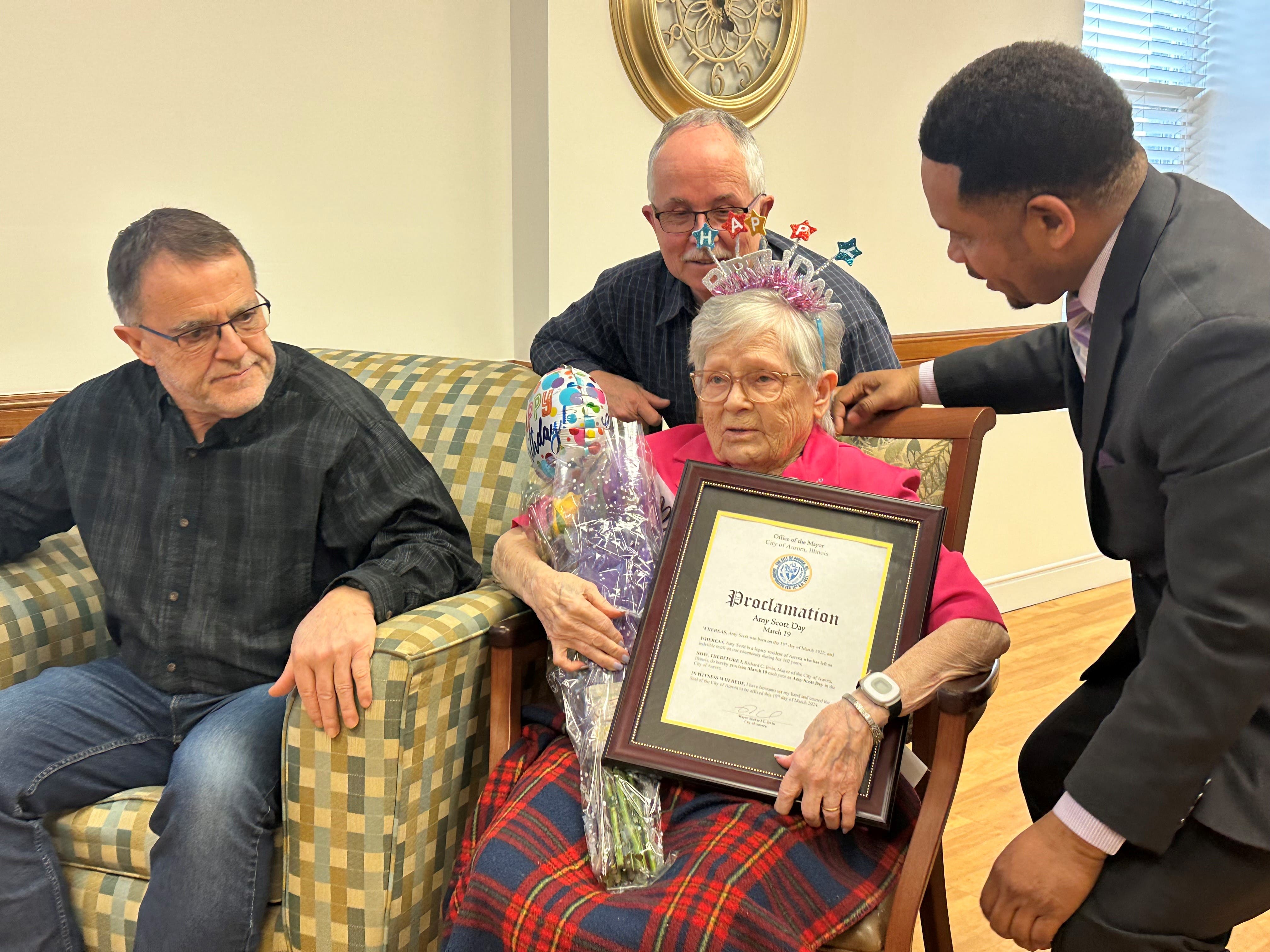 Scott gathered Tuesday with residents of Ascension Living Fox Knoll Village to celebrate her birthday with cake, a commemorative sign and a proclamation.