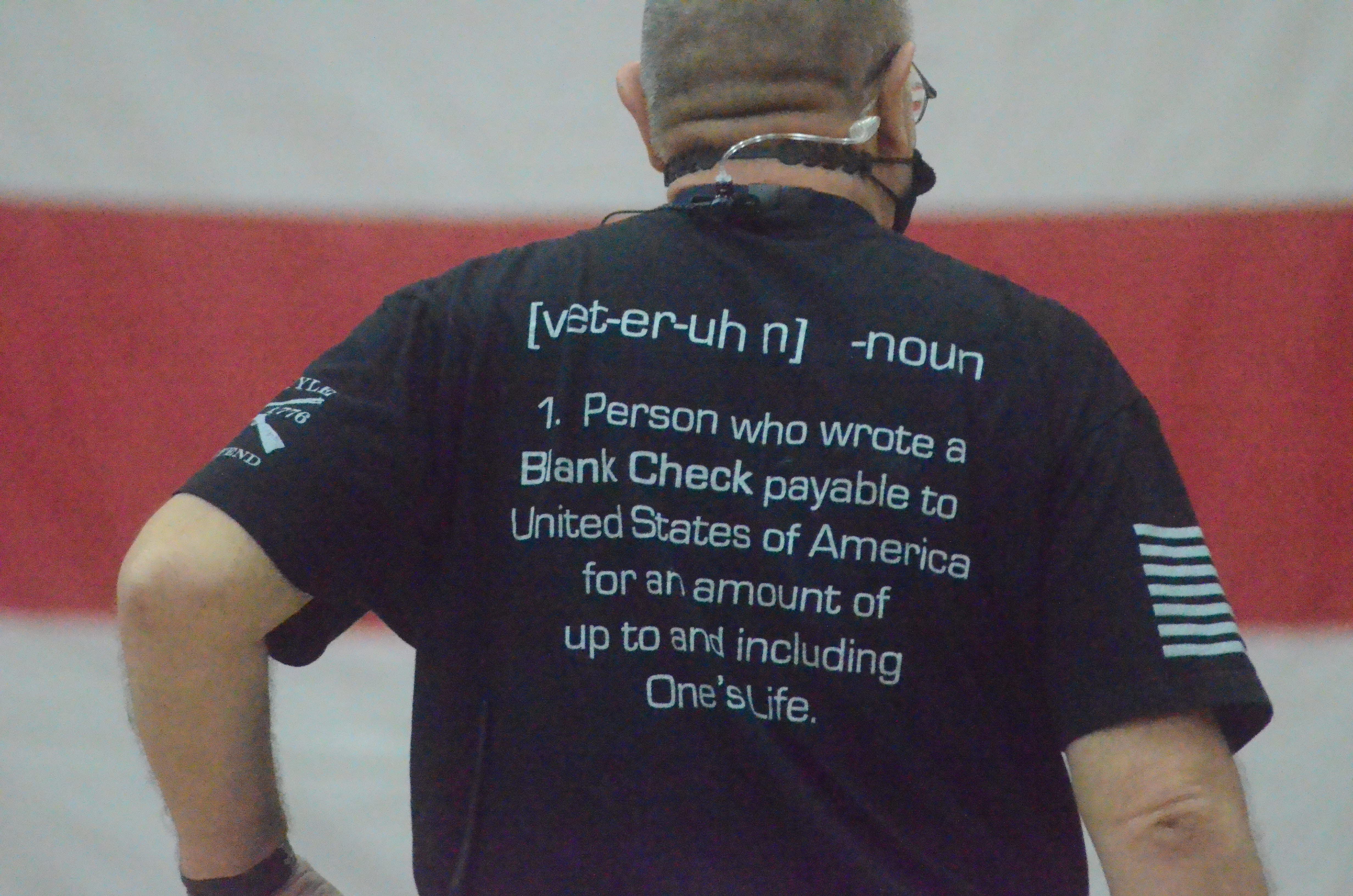 A man at the West Aurora High School veterans assembly Wednesday wears a shirt that defines "veteran."