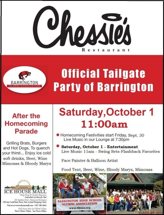 Don't miss the Barrington High School Annual Alumni Homecoming Celebration and party at Chessie’s Restaurant on Saturday, October 1 starting at 11am. The alumni the festivities start Friday night with Live Music in our lounge at 7:30pm and alumni drink specials. The Barrington High School Homecoming parade begins at 10am and the Annual Barrington Alumni party at Chessie's begins on Saturday after the parade at 11am with Live Music by Swing Sets. Chessie's will be grilling burgers, brats, hot dogs and serving beer, wine and Chessie’s famous Mimosas and Bloody Mary’s. There will be entertainment and fun for the whole family with Mr. Kris the Face painter and Jack the Balloon Artist. Bring the whole family and enjoy the BHS Alumni tailgate party at Chessie’s Restaurant. For more information or to plan your individual Alumni class party call Chessie's at 847-382-5020.