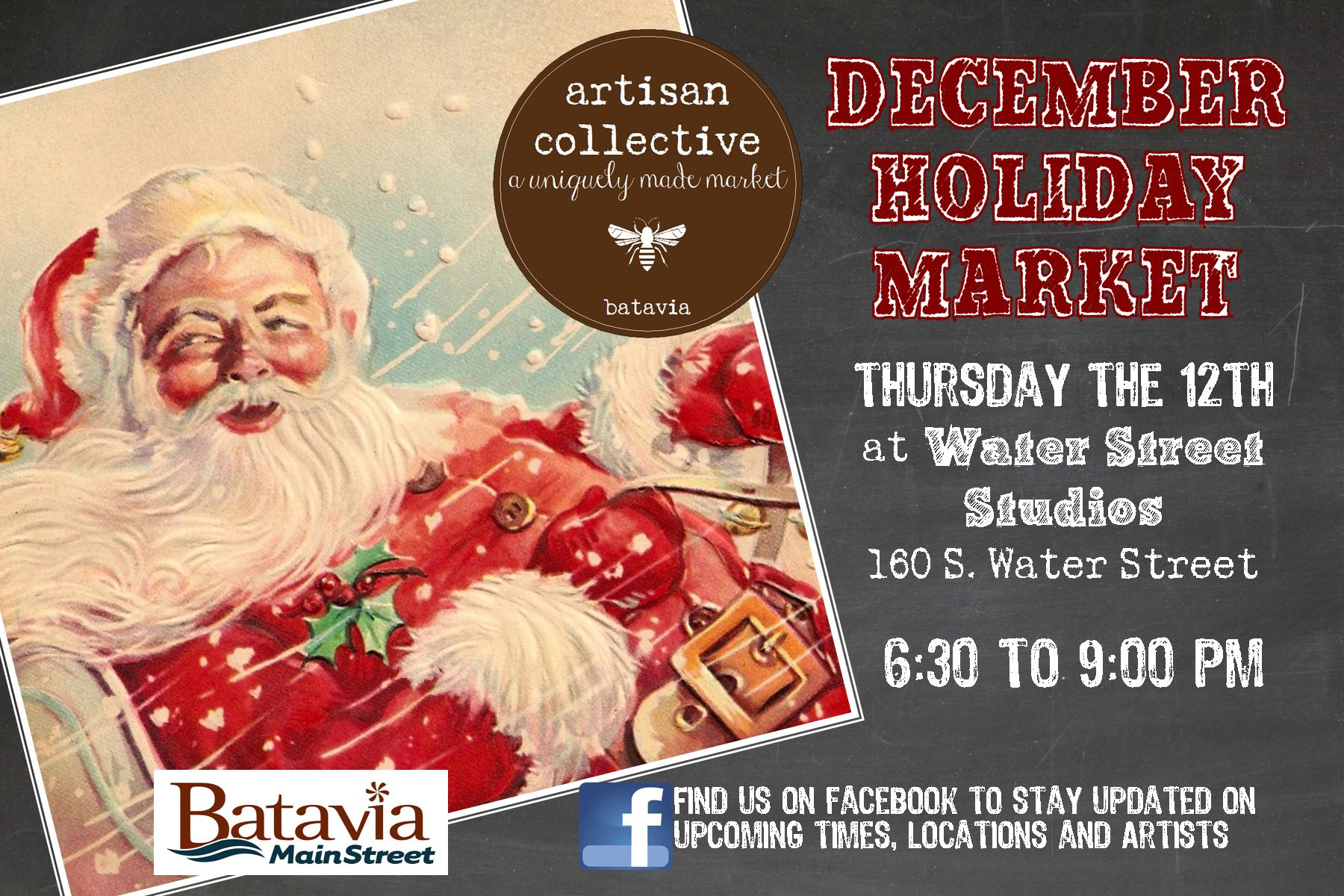 Thursday, December 12th from 6:30pm to 9pm, join us for the awesomely unique pop-up market shopping experience. This month our artisans will be surrounded by the amazing artwork of Water Street Studios at 160 S. Water Street in Batavia! Live music by StingZ@RMS