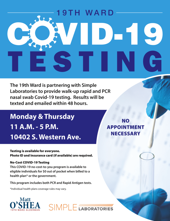 CHICAGO — If you need a COVID-19 test before you head out to family gatherings or go back to college, the 19th Ward and Simple Laboratories have partnered to offer walk-up nasal COVID-19 testing for 19th Ward residents on Mondays and Thursdays from 11 a.m. to 5 p.m. at the 19th Ward Mobile Site, 10402 S. Western Ave. Results should be emailed within 48 hours.