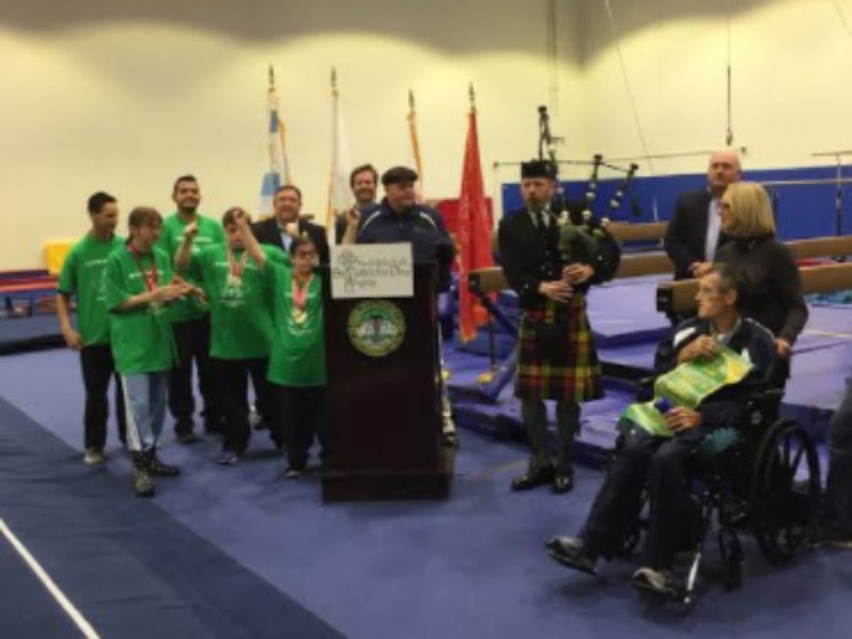 Kevin Magnuson, president of Special Children's Charities and Special Olympics Chicago, joined Chicago's Special Olympics athletes who will compete in the 2018 Special Olympics National Games at the parade's announcement ceremony at the Morgan Park Sports Complex. Those athletes are Allison Berggren, Aiden Fallon and Justin Mayer.