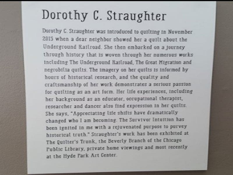 Before 2015, Straughter says she did not know the first thing about quilting and was never interested in studying history. Fast forward just a few years, and she's had exhibits featured locally at the Beverly Arts Center and in the Beverly Art Walk as well as other art centers in Chicago like the Hyde Park Art Center, the Beverly branch of the Chicago Public Library, the Dank Haus German American Cultural Center on the North Side and Stony Island Arts Bank, where she began her research.