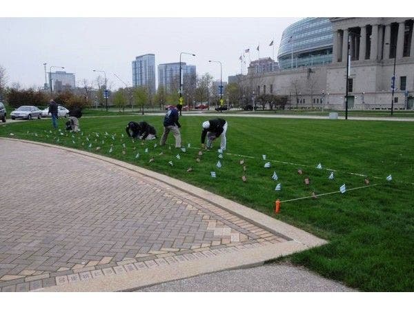 Photo: Volunteers ready Chicago police memorial before the 24-hour honor vigil last May. | CPMF