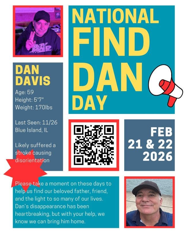 CHICAGO — After three months with no new leads or sightings, the search for Dan Davis, 59, is going national. His daughter, Wendy Davis, is asking for volunteers to join the search team this weekend, Feb. 21 and Feb. 22, for “National Find Dan Day.”