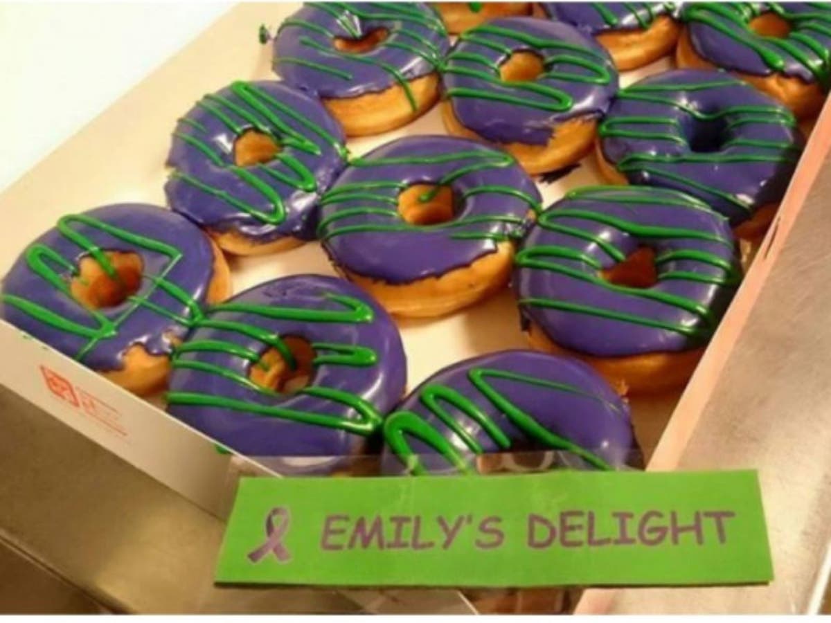 CHICAGO, IL - The "Emily's Delight" donuts are coming back to the Dunkin' Donuts in Mount Greenwood for a limited time. The purple and green donuts, which honor the memory of beloved neighborhood resident Emily Beazley, will be sold as a benefit in which proceeds will be donated to the Kures for Kids St. Baldrick's Hero Fund.