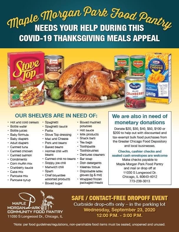 CHICAGO — Maple Morgan Park Food Pantry needs some help this COVID-19 Thanksgiving. The pantry will be holding a food drive from noon to 3 p.m. Wednesday, Sept. 23. Donations may be dropped off curbside in the parking lot at 11300 S. Longwood Drive, Chicago. This is a safe, contactless event.