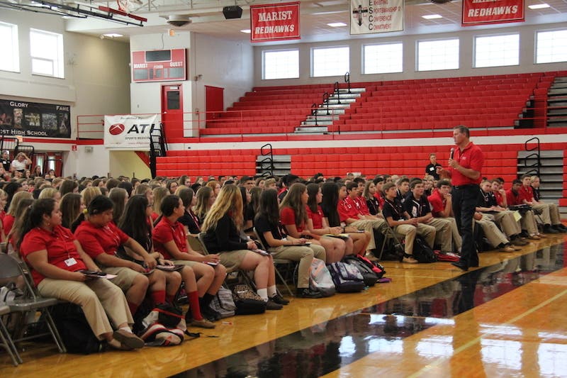 Administrators spoke to the group of eager freshmen during orientation on Aug. 23. Marist President Br. Hank Hammer welcomed them home, while Marist Principal Larry Tucker challenged the first-year students to start defining themselves now.