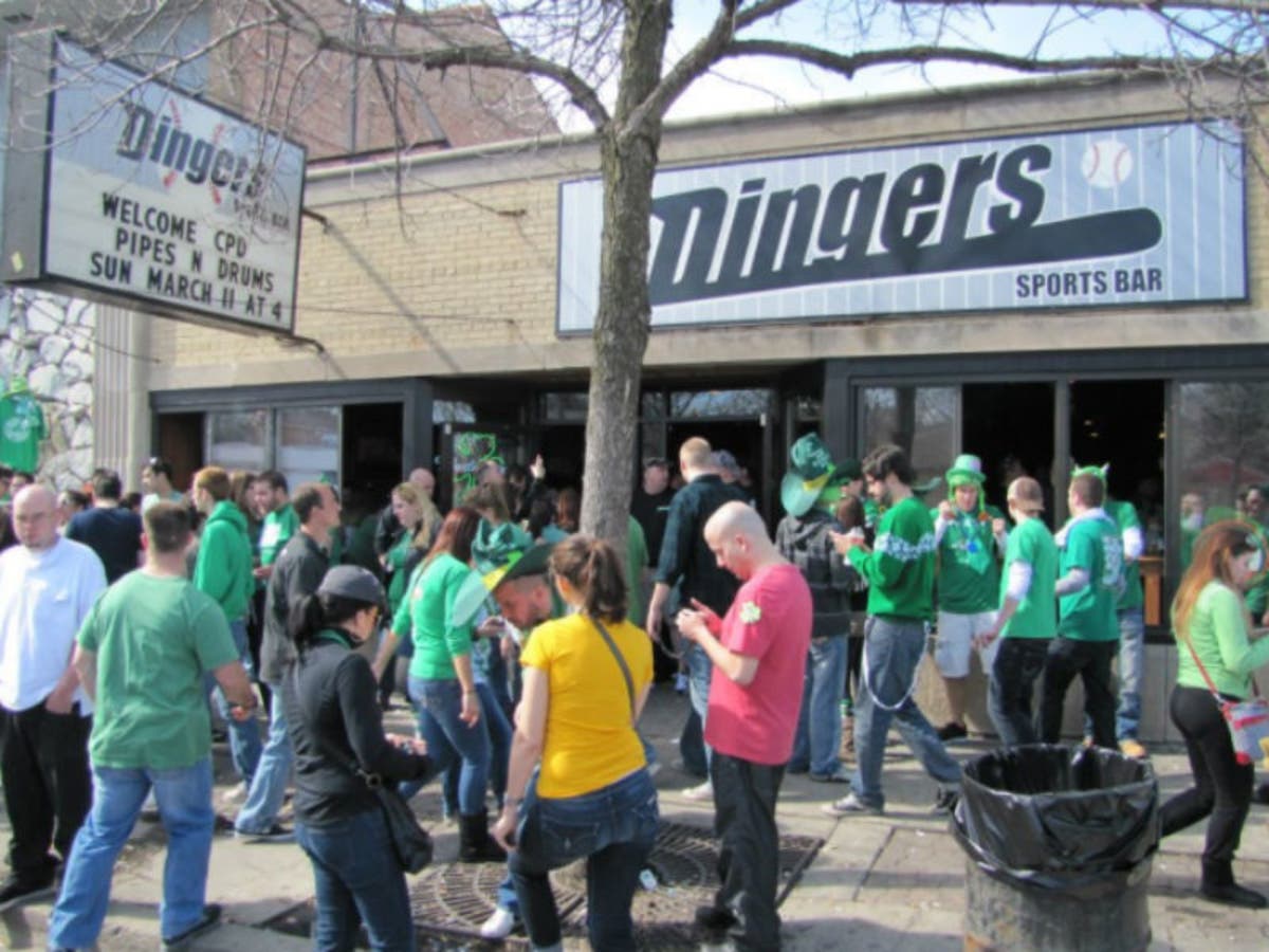 Photo: Parade enthusiasts gather outside Dingers during the 2012 South Side Irish Parade. The sign in front, showing a 4 p.m. appearance by the Chicago Police Pipe & Drums on Sunday, March 11, remains accurate six years later.
