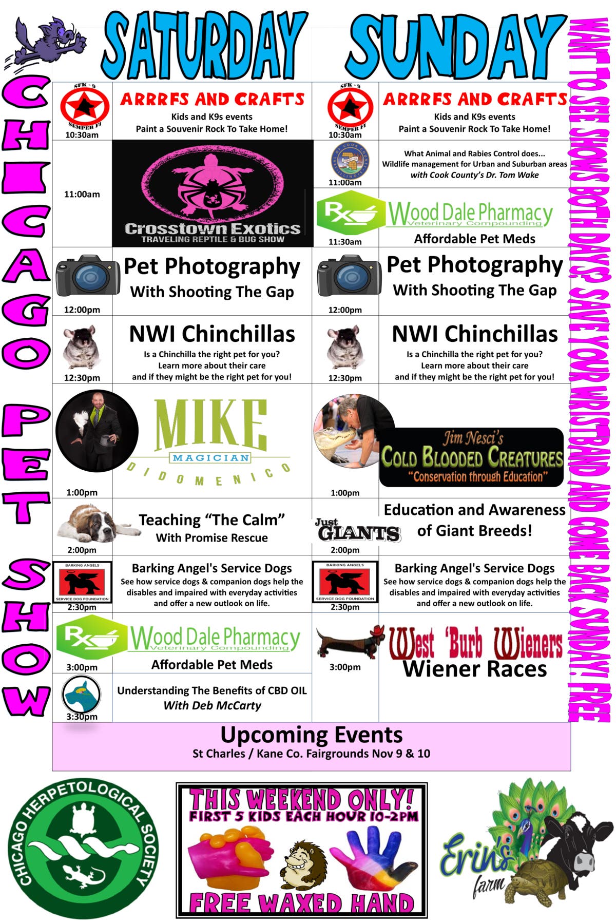 The Chicago Pet Show offers fun, education and the chance help dozens of rescued animals. On tap for the weekend are world renowned reptile expert Jim Nesci with his interactive reptile presentation, Magic Mike, a pet boutique, NWI Chinchillas, West Burb Weiner Races, Crosstown Exotics Traveling Reptile and Bug Show, Cook County Animal and Rabies Control and more.