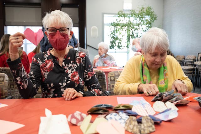 CHICAGO, IL — More than two dozen Smith Village residents and St. Cajetan student council members gathered on Valentine’s Day to make gifts for 45 veterans.