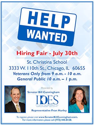 Sen. Bill Cunningham and Rep. Fran Hurley are teaming up with the Illinois Department of Employment Security in hosting a Hiring Fair on Thursday, July 30.