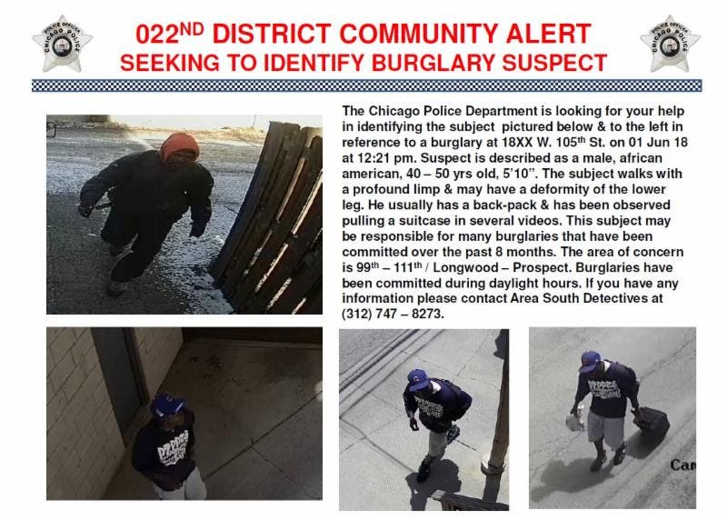 CHICAGO, IL - A burglar who police suspect has been targeting neighborhood residents who live near Longwood Drive for the past eight months was caught on camera committing one of his crimes last week. 22nd District police shared several surveillance images of the man photographed in the 1800 block of West 105th Street shortly after noon on June 1.