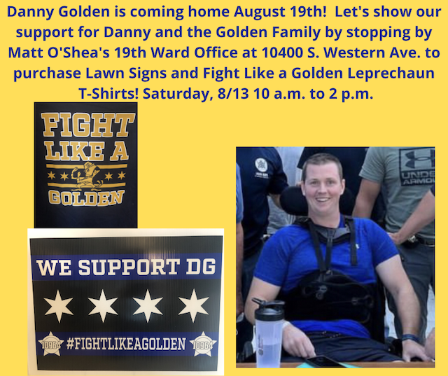 CPD Officer Danny Golden is coming home next week. Stop by the 19th Ward Office, Saturday, Aug. 13. Yard signs and T-shirts are for sale.