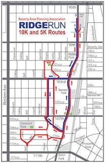 The Ridge Run races start and end at Ridge Park, covering much of Longwood Drive as far south as 110th Street, heading as far west as Oakley Avenue and continuing on a good chunk of Hoyne and Seeley avenues. The 5K wraps around Longwood and Seeley with turns at 108th Place and 103rd Street.