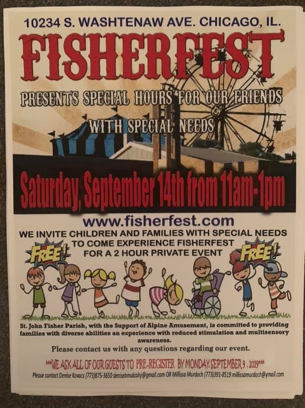 Fisherfest has set aside a certain time for children and families with special needs to attend. This will be from 11 a.m. to 1 p.m. on Saturday, Sept. 14. Pizza and Pop will be served at 12:30 p.m. Pre-register by texting/calling Millissa Murdoch at 773-391-8519 or millissamurdoch@ymail.com.