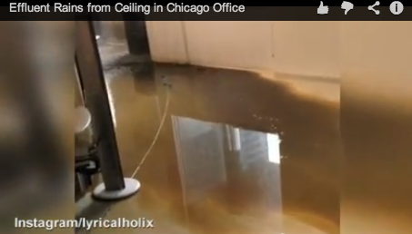 NBC Chicago described this scene: "Feces rained down from the ceiling onto the 15th-floor offices and began pooling after a pipe burst. Indeed the video, which later resurfaced on YouTube, shows a dark-colored substance flowing onto a cubicle."