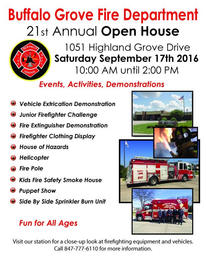 BUFFALO GROVE, IL - The Buffalo Grove Fire Department will be hosting the 21st annual Fire Department Open House on Saturday, Sept. 17, 2016 from 10 a.m. until 2 p.m. The Open House will be held at the Buffalo Grove Fire Department Headquarters, 109 E. Deerfield Parkway in Buffalo Grove.