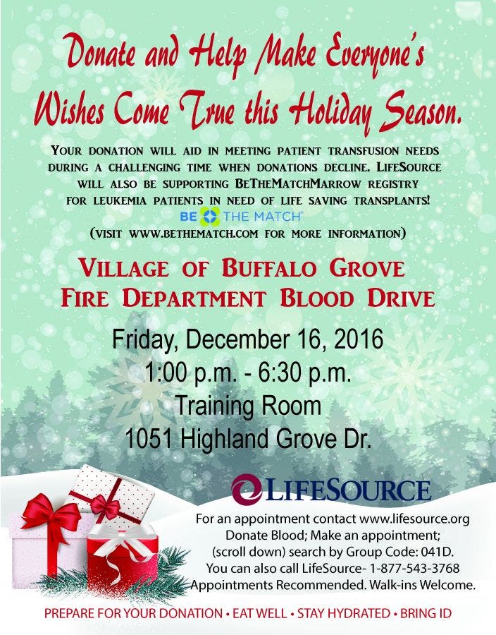 The Blood Drive will be held on Friday, December 16 from 1:00 p.m. until 6:30 p.m. in the Buffalo Grove Fire Department training room, 1051 Highland Grove Drive, Buffalo Grove.