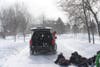 Ever heard of skitching? It’s a combo of skiing and hitching a ride on a car. Sounds stupid, idiotic and dangerous, right? It didn’t matter a bit on Wednesday. With dog leashes hitched to my truck, my kids, their friends and many neighboring kids in tow, got on their sleds and held the dog leashes for dear life. My husband drove the truck all over the icy and snowy neighborhood streets and the kids only begged for more.