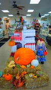 The oversized pumpkin is displayed just inside the store's entrance, and entry forms are at the meat counter.