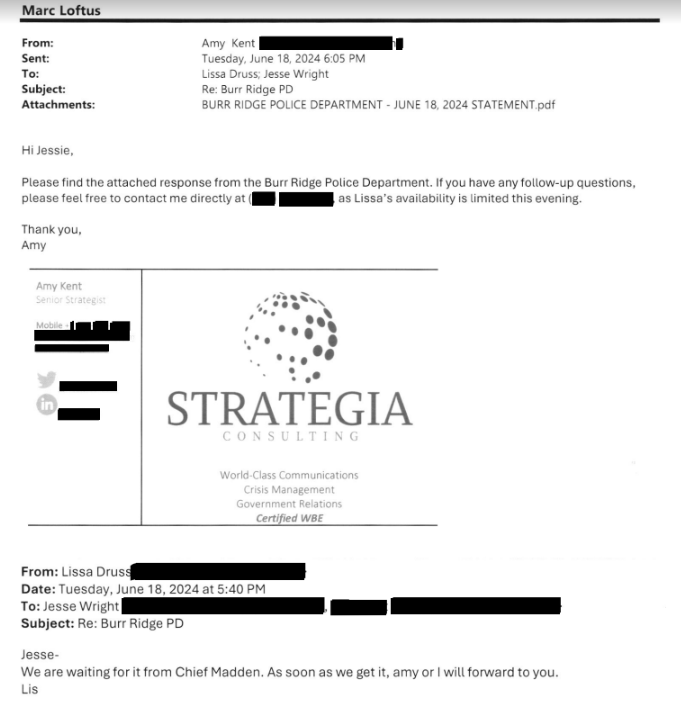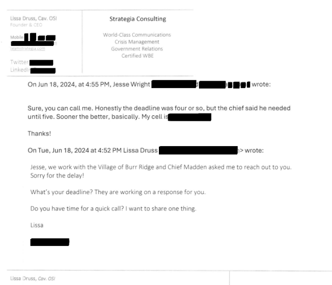 Shortly before 5 p.m., Druss emailed Tribune reporter Jesse Wright that her firm now worked for the village and that Police Chief John Madden asked her to contact the reporter.