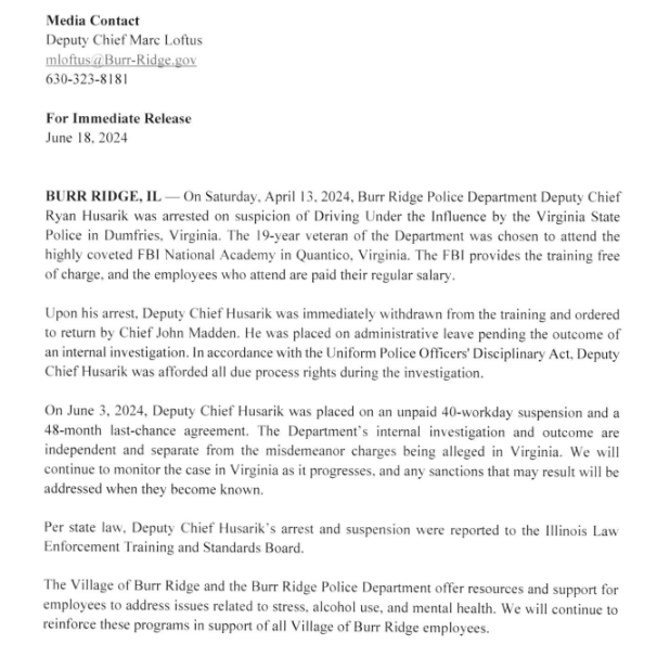 The next day, emails show Wright was in communication with Burr Ridge officials about Husarik's arrest, saying he was planning a story.