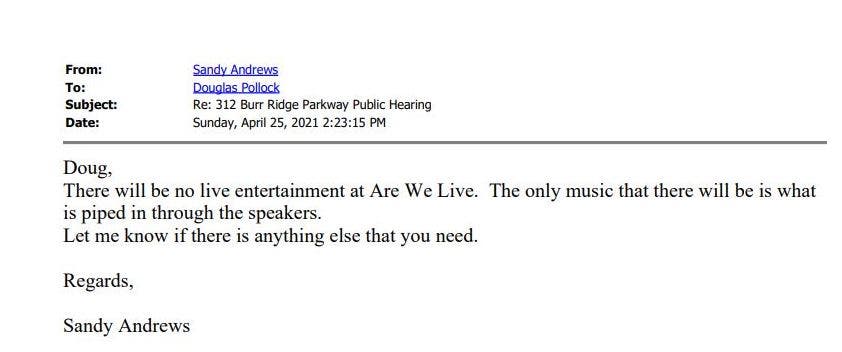 Patch reported numerous times throughout the hearing process about Are We Live's promise not to have live music, based on the statement from Andrews.