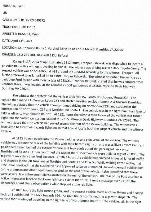 A Virginia state trooper said in her report that she witnessed Husarik swerve over lines and press on the brakes repeatedly for no reason. Then Husarik drifted over the yellow line into oncoming traffic on a state highway, the trooper said.