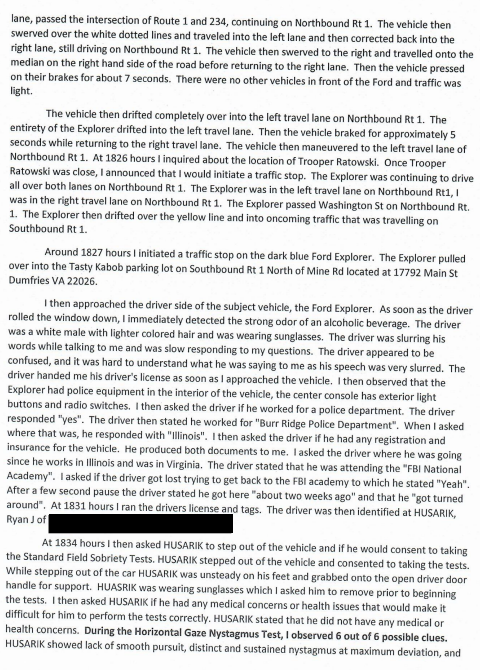 Through a public records request to Burr Ridge police, Patch obtained the full report of Deputy Chief Ryan Husarik's arrest in Virginia. Husarik could not be reached for comment.
