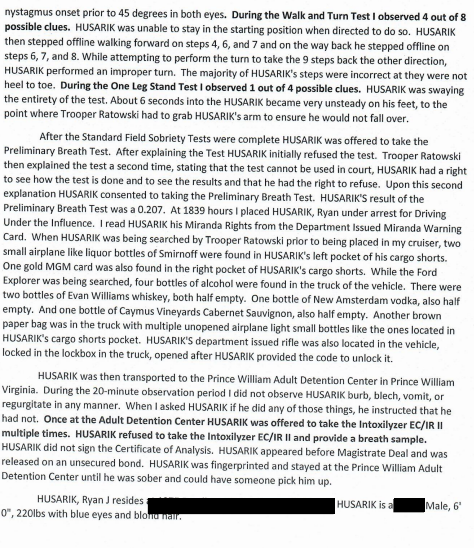 Troopers took Husarik to the Prince William County Jail, where he repeatedly refused to undergo a breathalyzer test. Such a test can be used in court in Virginia, as opposed to one on the side of the road