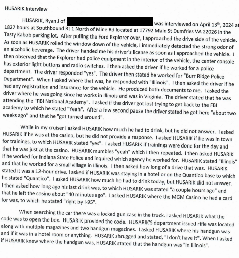 Asked whether he was a police officer, Husarik, who makes $150,000 a year, confirmed he was and identified his department. He said he was attending the FBI Academy near Quantico, which was about 10 miles away, police said.